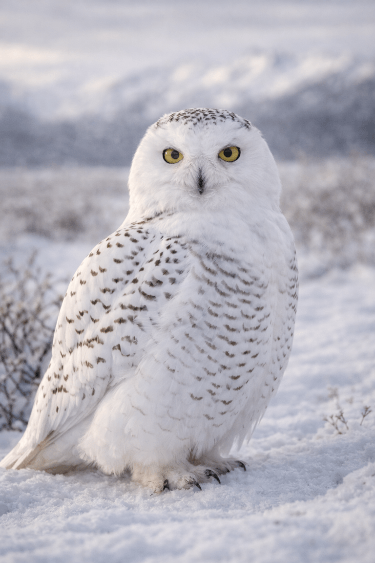 Seeing a Snowy Owl in Alaska feels almost unreal. Against open tundra or frozen flats, they look like part of the landscape — a white shape sitting motionless until it turns its head and those bright yellow eyes lock onto movement.