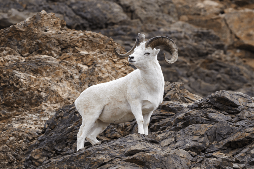 Dall sheep are white mountain sheep found in Alaska’s high alpine regions. Their curved horns and bright coats stand out against rocky cliffs and snowfields. They are built for elevation.