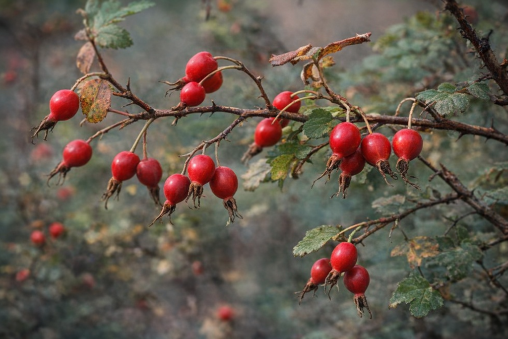 Rose hips are the seed-containing fruit of wild roses (Rosa spp.), forming after the flowers bloom and fade.
