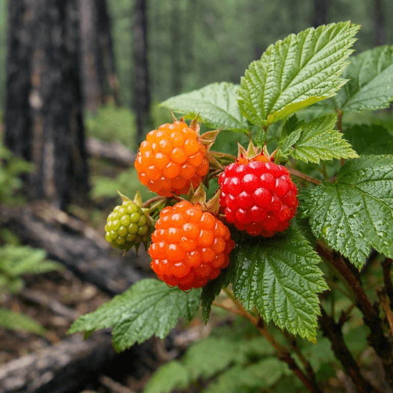 Salmonberries are one of the first berries to ripen in Alaska each summer. Bright orange to deep red, they grow in dense shrubs along forest edges, coastal trails, and river corridors.