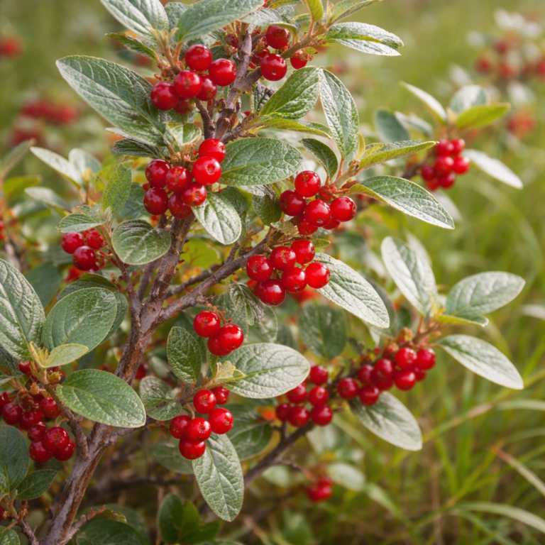 • Red, translucent berries growing along stems