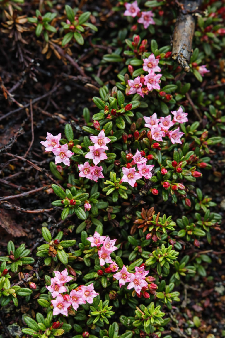 Alpine Azalea (Loiseleuria procumbens) is a small evergreen shrub adapted to extreme cold and exposed environments. It grows in tight mats, staying low to avoid harsh winds and freezing conditions.