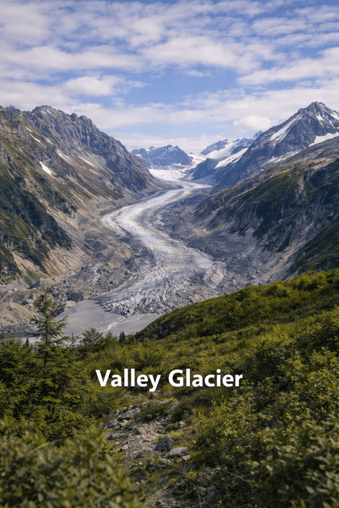 Valley glaciers flow down mountain valleys, following the natural shape of the land. They are the most common glacier type in Alaska and often the easiest to recognize.