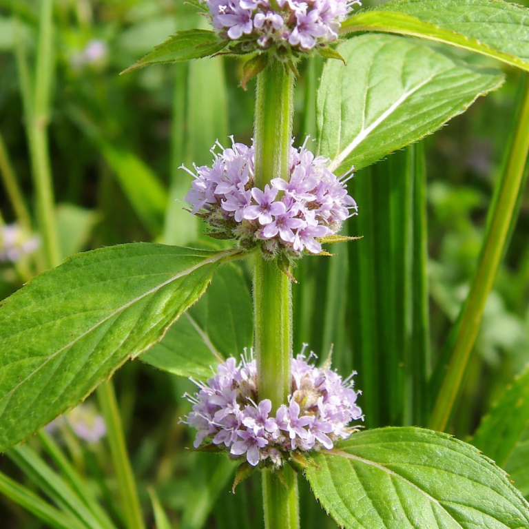 Wild Mint (Mentha arvensis) is a perennial herb in the mint family, known for its cooling scent and flavor. It grows upright with soft leaves and small clusters of flowers along its stems.