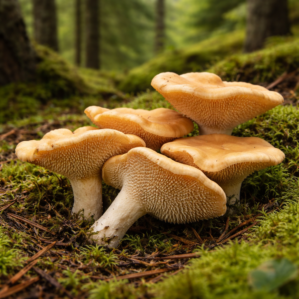 Hedgehog mushrooms show up quietly in forested areas, often mixed in with moss and low ground cover.