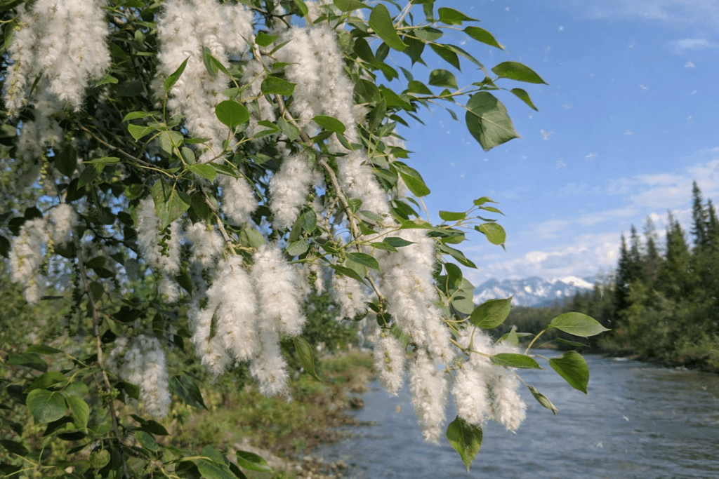 Cottonwood trees are large deciduous trees closely related to poplars. In Alaska, they are often found in the same riparian environments as balsam poplar. They are known for releasing fluffy white seeds in late spring that drift through the air like snow. When cottonwood seeds float through the air in late spring, it marks a transition into early summer in many parts of Alaska