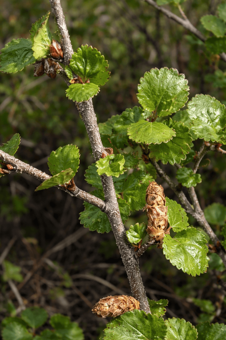 Dwarf birch is a low-growing shrub found in tundra and northern regions of Alaska. Unlike tall paper birch trees, dwarf birch hugs the ground to survive wind and cold. It is part of the classic Arctic plant community.