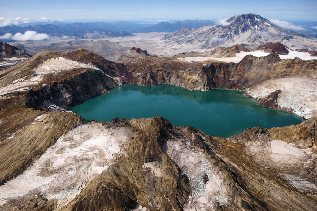 What makes Katmai different is that the mountain itself isn’t the main feature anymore — it’s what’s left behind. During the 1912 eruption, the summit collapsed, forming a massive crater that’s now filled with a deep blue lake. That eruption is considered the largest volcanic eruption of the 20th century, and it reshaped the entire area.